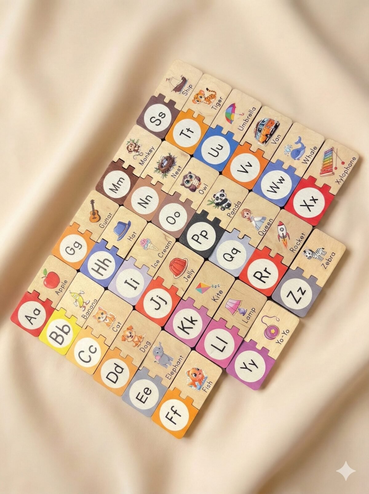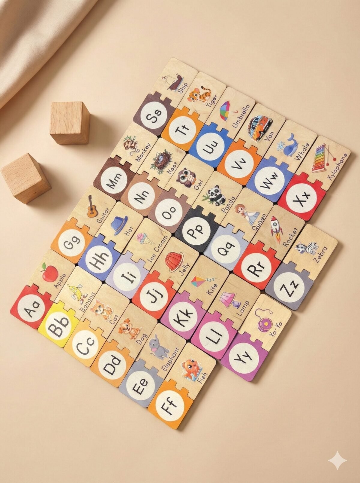 All 52 pieces fit neatly inside the solid wooden storage box, making it great for travel, tidy playrooms, and classroom shelves. This set promotes visual learning, fine motor skills, memory development, and early reading readinessβall through joyful, screen-free play.