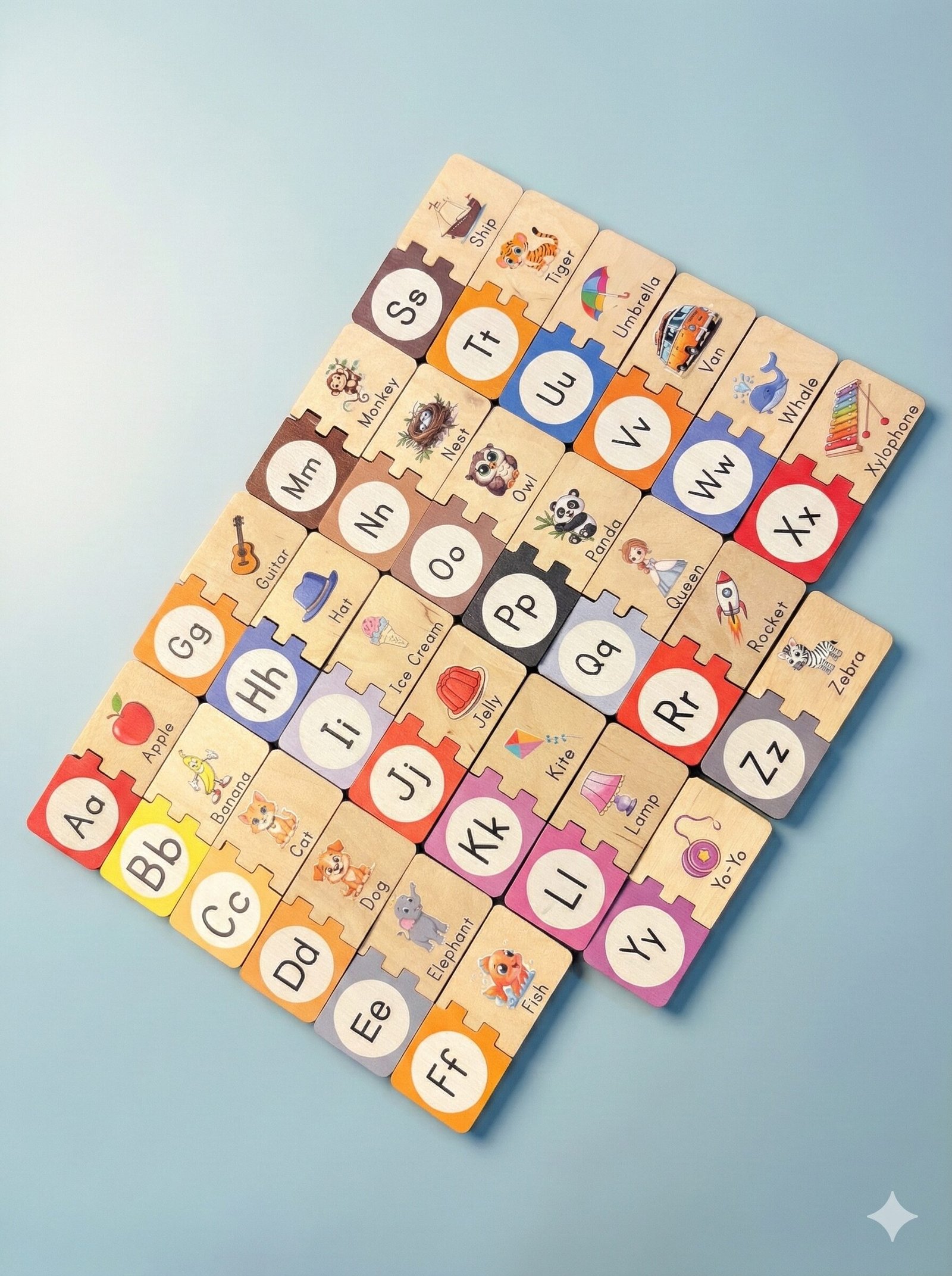All 52 pieces fit neatly inside the solid wooden storage box, making it great for travel, tidy playrooms, and classroom shelves. This set promotes visual learning, fine motor skills, memory development, and early reading readinessβall through joyful, screen-free play.